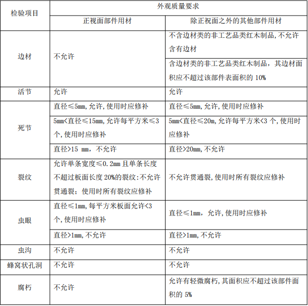 木材品质参照执行 GB/T 35475-2017 红木制品用材规范5.2表1中对于木材外观质量的有关条款,如下: