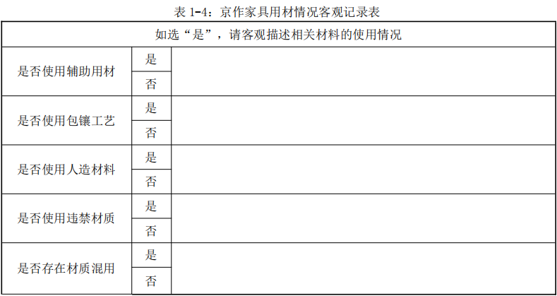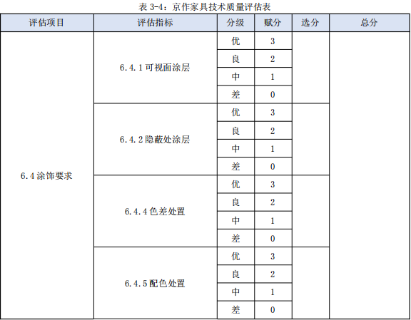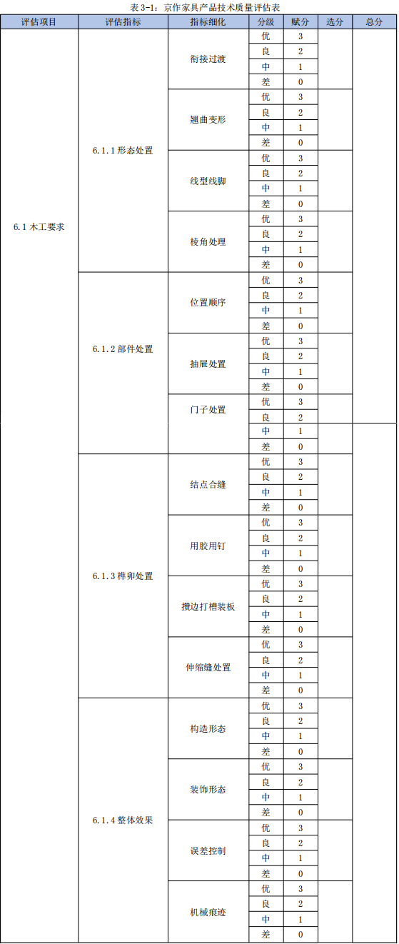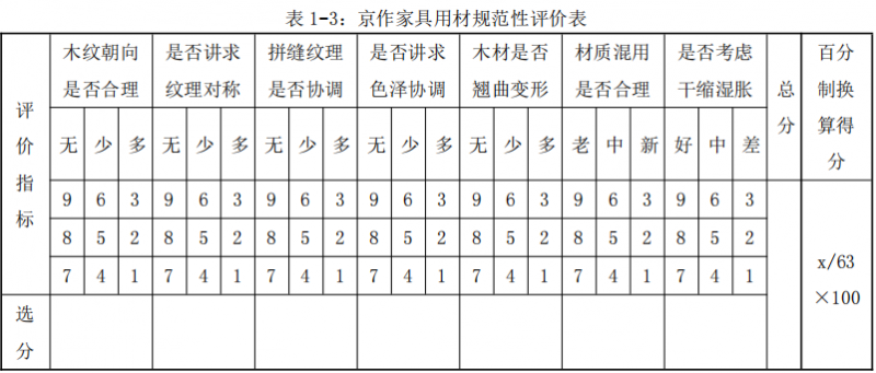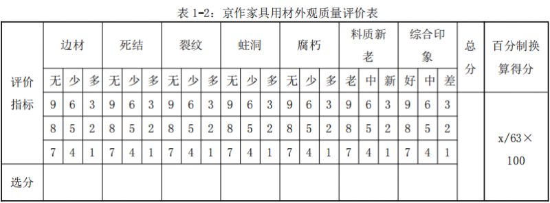 如下表1-1至1-3所示,对京作(硬木)家具选材用材的评价主要结合材种的属性、用材的外观质量和用材的规范性三方面进行打分评价,同时结合表1-4要求的相关情况进行文字描述。