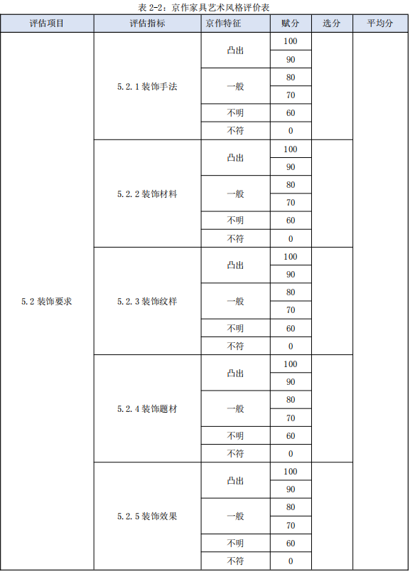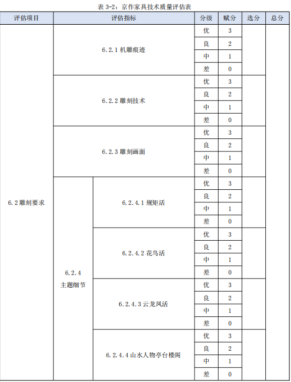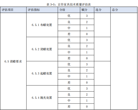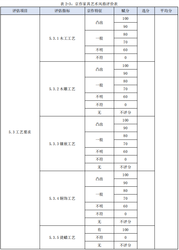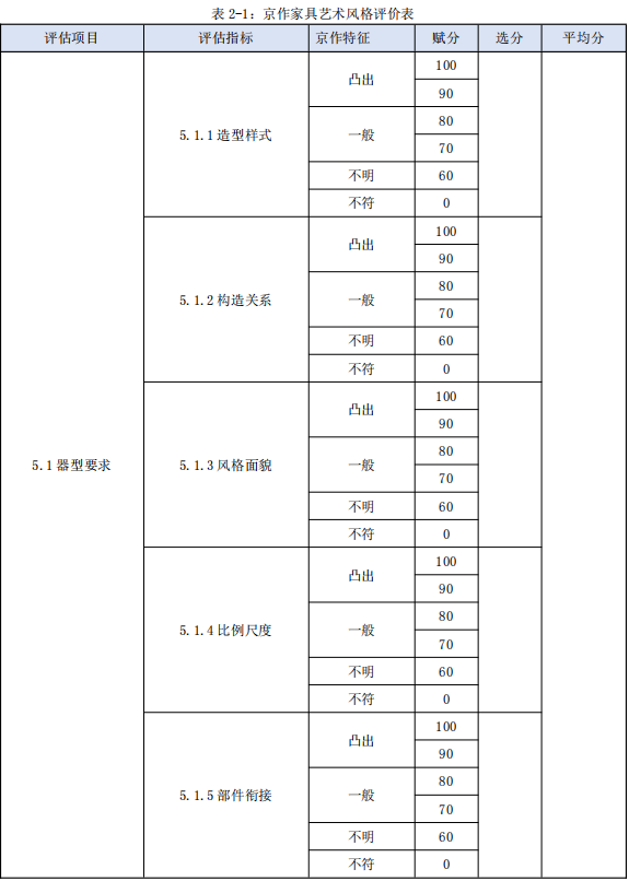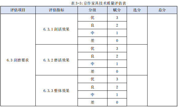 如下表所示,分别赋予相应评估项目下的评估指标一定分数,京作特征突出者分作两档,分别赋分100和90,京作特征表现一般者亦分作两档,分别赋分90和80,风格特征不明者直接记为60分,特征不符者记为0分,有烫蜡工艺者记为100分,烫蜡工艺不符者记0分,未出现的工艺不计分。评估项目和指标的编号与本文件相应条款编号一一对应,评委评分时可按照相应编号下的要求细则进行选分。